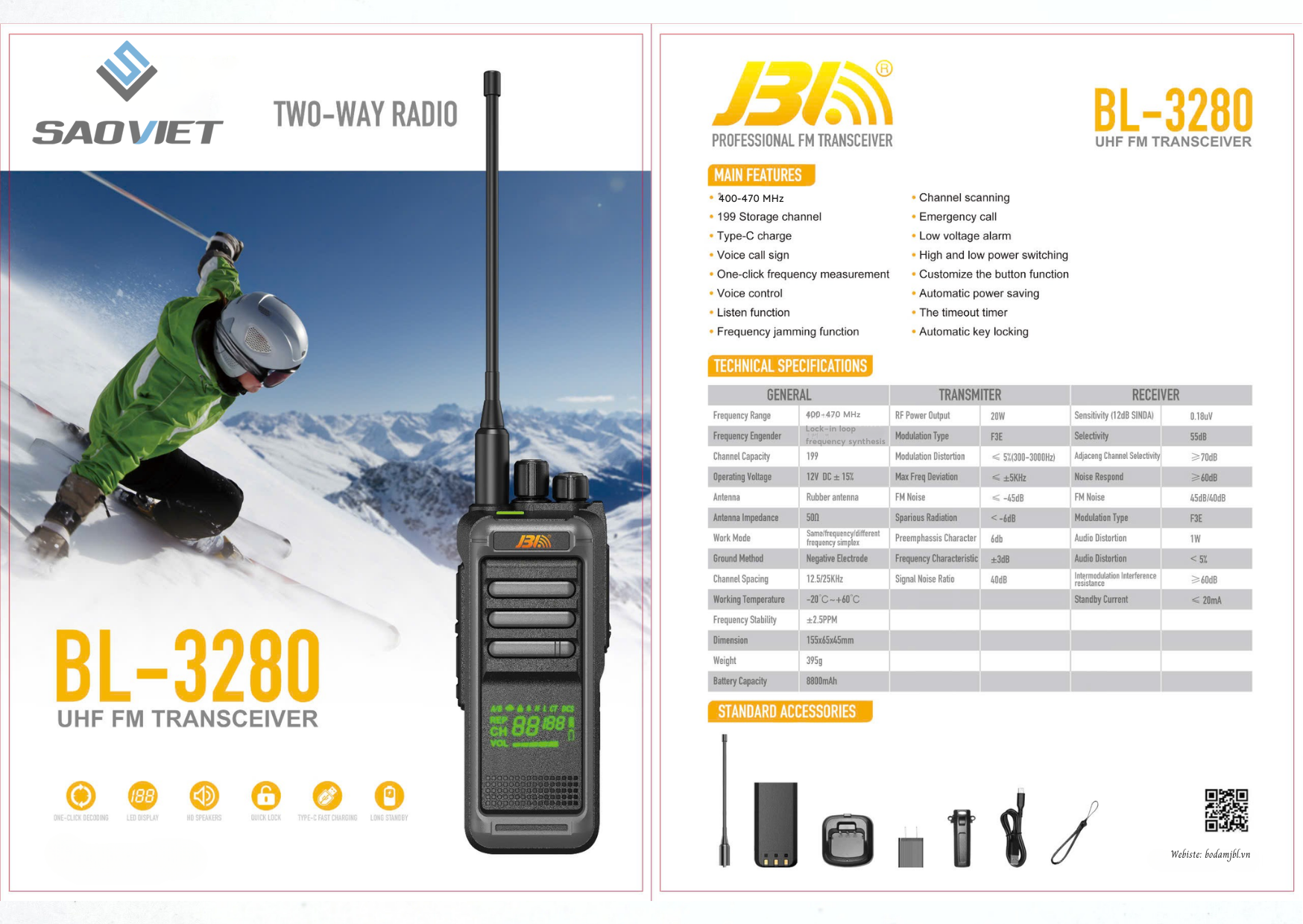 Máy bộ đàm JBL BL-3280 là dòng bộ đàm cầm tay HIỆN ĐẠI MỚI nổi bật của hãng JBL. Bộ đàm có ưu điểm nổi trội: Công suất lớn, Pin siêu trâu, và chất lượng âm thanh tuyệt vời.